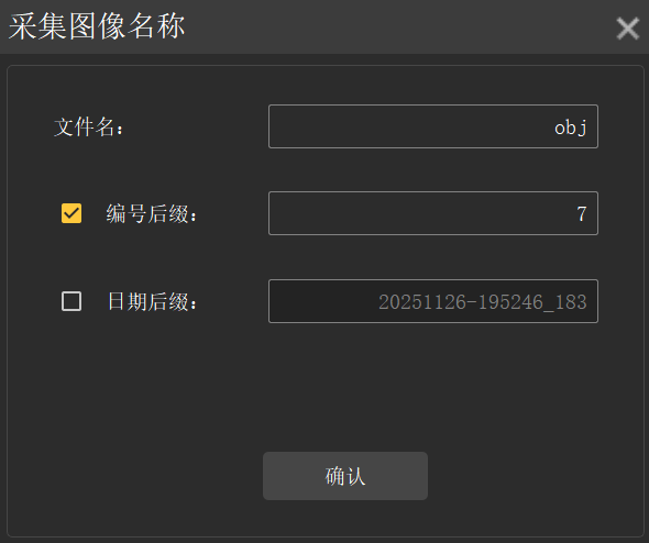 进入主界面,开始采集前输入“文件名”,采集的图像将以此命名,若未手动输入则软件将根据设定规则自动命名,详见“项目管理”章节。