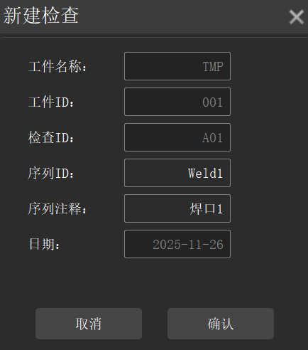 用户需输入Componet(工件)、Study(检查)、Series(序列)、SOP每一层的基本信息,SOP层信息即主界面的文件名。